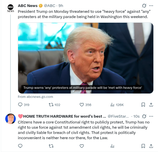 Trumps birthday present to himself, if violent, could cost taxpayers half a $Trillion in liability for breach of civil rights. I would cancel the parade as a public liability, the taxpayer is not willing to bear.